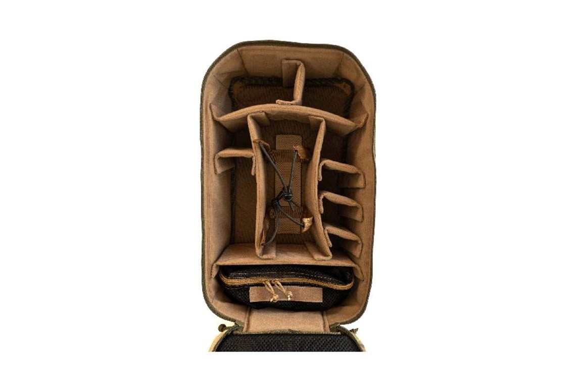Denna ryggsäck har ett huvudfack som kan delas in i nödvändiga sektioner för att placera olika utrustningsdelar.